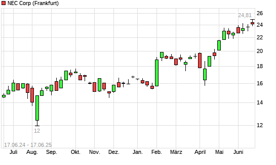 Mit dem Anstieg auf 24,21 EUR hat die NEC-Aktie (ISIN JP3733000008) am 16.06.2025 ein neues 10-Jahres-Hoch erreicht und damit den Kurs vom 09.06.2025 eingestellt.