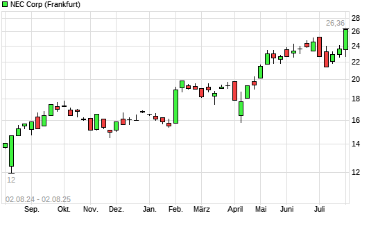 Mit dem Anstieg auf 26,36 EUR hat die NEC-Aktie (ISIN JP3733000008) am 01.08.2025 ein neues 10-Jahres-Hoch erreicht und damit den Kurs vom 30.06.2025 eingestellt.