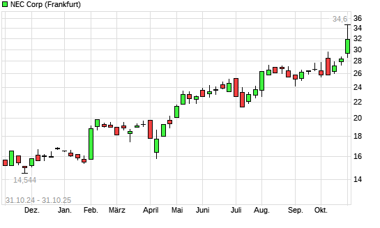 Mit dem Anstieg auf 32,51 EUR hat die NEC-Aktie (ISIN JP3733000008) am 30.10.2025 ein neues 10-Jahres-Hoch erreicht und damit den Kurs vom 29.10.2025 eingestellt.