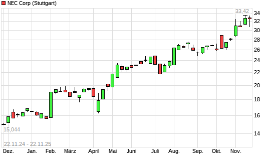 Mit dem Anstieg auf 33,14 EUR hat die NEC-Aktie (ISIN JP3733000008) am 21.11.2025 ein neues 10-Jahres-Hoch erreicht und damit den Kurs vom 30.10.2025 eingestellt.