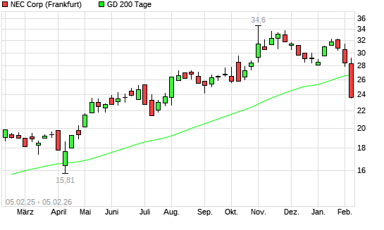 Mit dem Rücksetzer auf 24,75 EUR hat die NEC-Aktie am 04.02.2026 die 200-Tage-Linie nach unten gekreuzt.