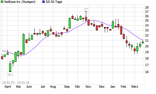 Mit dem Rücksetzer auf 20,60 EUR hat die NETEASE O.N.-Aktie am 17.03.2026 die 50-Tage-Linie nach unten gekreuzt.