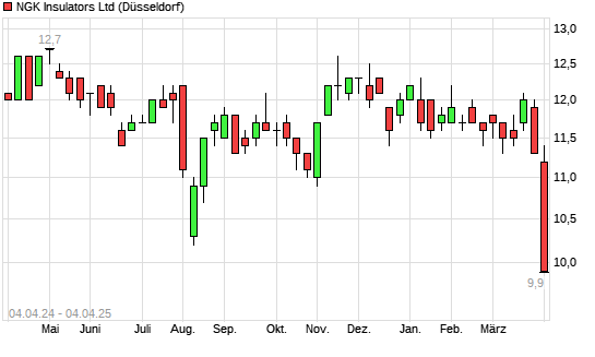 Mit dem Rücksetzer auf 10,80 EUR hat die NGK Insulators-Aktie (ISIN JP3695200000) am 03.04.2025 ein neues 6-Monats-Tief erreicht und damit den Kurs vom 25.10.2024 eingestellt.