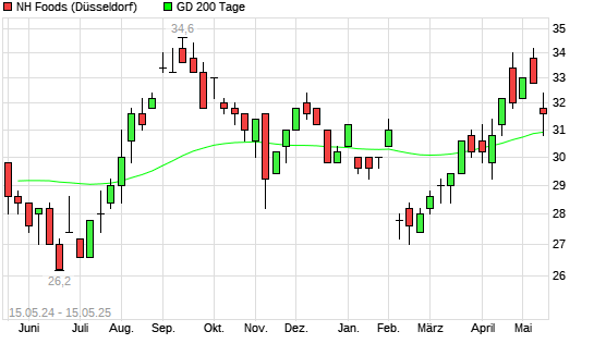 Mit dem Rücksetzer auf 31,20 EUR hat die NH Foods-Aktie am 14.05.2025 die 200-Tage-Linie nach unten gekreuzt.