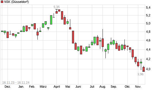 Mit dem Rücksetzer auf 3,98 EUR hat die NSK-Aktie (ISIN JP3720800006) am 15.11.2024 ein neues 10-Jahres-Tief erreicht und damit den Kurs vom 13.11.2024 eingestellt.