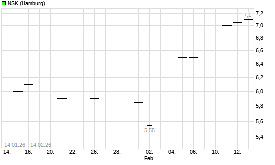 Mit dem Anstieg auf 7,15 EUR hat die NSK-Aktie (ISIN JP3720800006) am 13.02.2026 ein neues 3-Jahres-Hoch erreicht und damit den Kurs vom 12.02.2026 eingestellt.