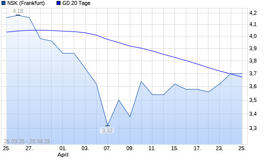 Mit dem Anstieg auf 3,70 EUR hat die NSK-Aktie am 24.04.2025 die 20-Tage-Linie nach oben gekreuzt.