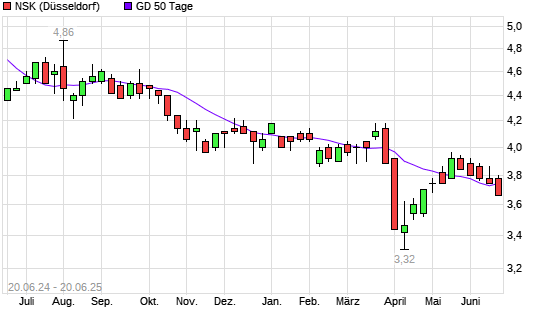 Mit dem Rücksetzer auf 3,78 EUR hat die NSK-Aktie am 19.06.2025 die 50-Tage-Linie nach unten gekreuzt.