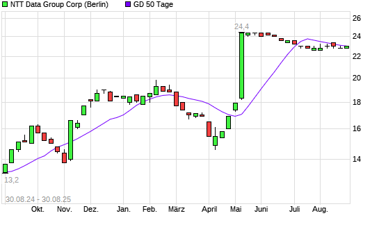 Mit dem Rücksetzer auf 23,00 EUR hat die NTT Data-Aktie am 29.08.2025 die 50-Tage-Linie nach unten gekreuzt.