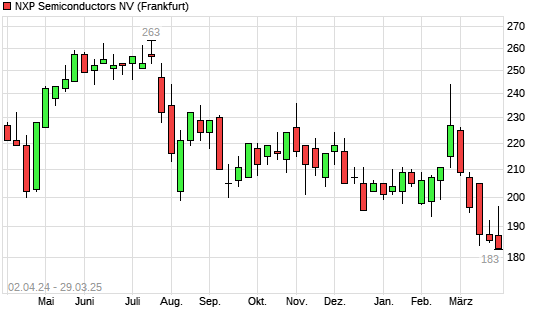 Mit dem Rücksetzer auf 183,00 EUR hat die NXP Semiconductors-Aktie (ISIN NL0009538784) am 28.03.2025 ein neues 12-Monats-Tief erreicht und damit den Kurs vom 21.03.2025 eingestellt.