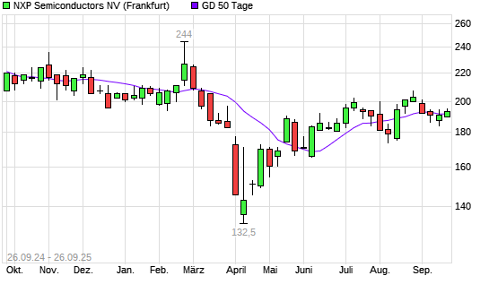 Mit dem Anstieg auf 193,00 EUR hat die NXP Semiconductors-Aktie am 25.09.2025 die 50-Tage-Linie nach oben gekreuzt.