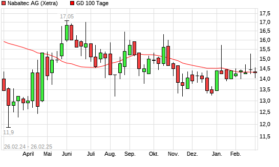 Mit dem Rücksetzer auf 14,20 EUR hat die Nabaltec-Aktie am 25.02.2025 die 100-Tage-Linie nach unten gekreuzt.