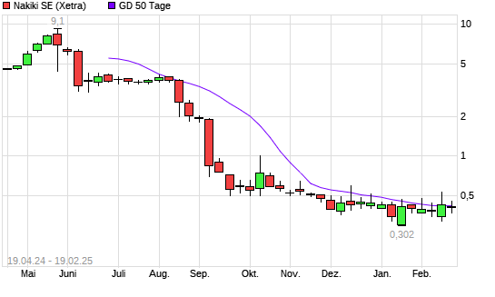 Mit dem Rücksetzer auf 0,38 EUR hat die Nakiki SE-Aktie am 18.02.2025 die 50-Tage-Linie nach unten gekreuzt.