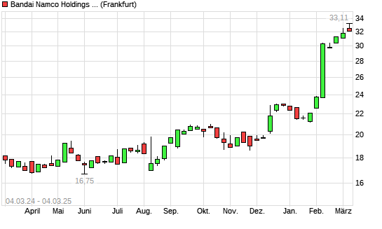 Mit dem Anstieg auf 33,11 EUR hat die Namco Bandai-Aktie (ISIN JP3778630008) am 03.03.2025 ein neues All-Time-High erreicht und damit den Kurs vom 26.02.2025 eingestellt.Die Namco Bandai-Aktie ...weiterlesen