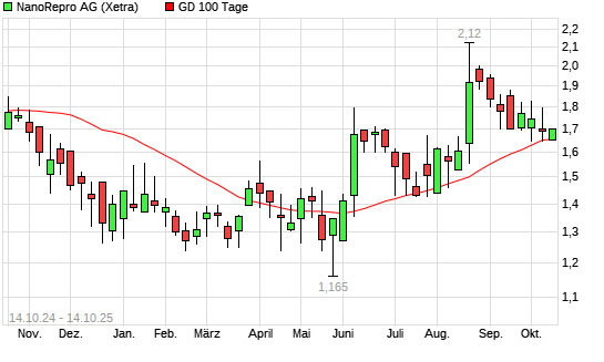 Mit dem Rücksetzer auf 1,59 EUR hat die NanoRepro-Aktie am 13.10.2025 die 100-Tage-Linie nach unten gekreuzt.