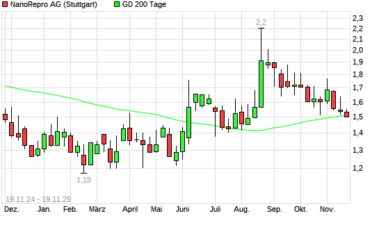 Mit dem Rücksetzer auf 1,44 EUR hat die NanoRepro-Aktie am 18.11.2025 die 200-Tage-Linie nach unten gekreuzt.