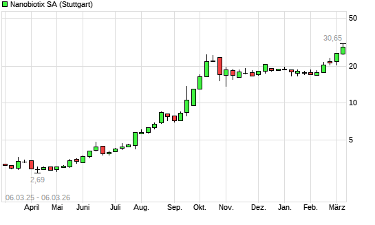 Mit dem Anstieg auf 29,40 EUR hat die Nanobiotix Ord Shs-Aktie (ISIN FR0011341205) am 05.03.2026 ein neues All-Time-High erreicht und damit den Kurs vom 09.10.2025 eingestellt.
