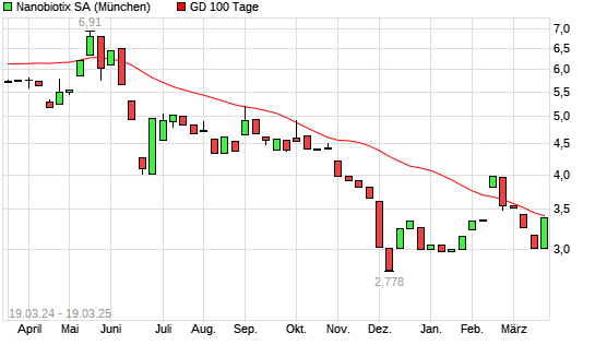 Mit dem Anstieg auf 3,33 EUR hat die Nanobiotix Ord Shs-Aktie am 18.03.2025 die 100-Tage-Linie nach oben gekreuzt.