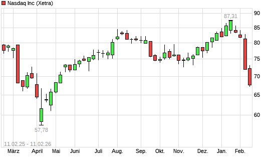 Mit dem Rücksetzer auf 69,21 EUR hat die Nasdaq Inc.-Aktie (ISIN US6311031081) am 10.02.2026 ein neues 6-Monats-Tief erreicht und damit den Kurs vom 06.02.2026 eingestellt.