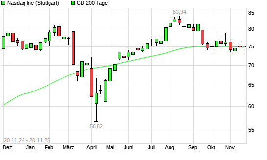 Mit dem Anstieg auf 74,61 EUR hat die Nasdaq Inc.-Aktie am 19.11.2025 die 200-Tage-Linie nach oben gekreuzt.