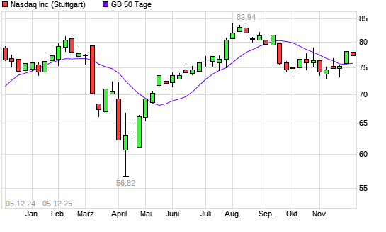 Mit dem Anstieg auf 77,37 EUR hat die Nasdaq Inc.-Aktie am 04.12.2025 die 50-Tage-Linie nach oben gekreuzt.Die Nasdaq Inc.-Aktie befindet sich seit dem 19.11.2025 im ...weiterlesen