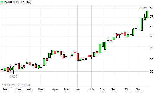 Mit dem Anstieg auf 76,96 EUR hat die Nasdaq Stock Market-Aktie (ISIN US6311031081) am 22.11.2024 ein neues All-Time-High erreicht und damit den Kurs vom 14.11.2024 eingestellt.