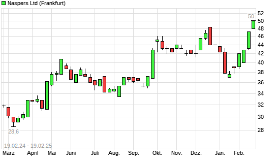 Mit dem Anstieg auf 246,00 EUR hat die Naspers-Aktie (ISIN ZAE000325783) am 18.02.2025 ein neues All-Time-High erreicht und damit den Kurs vom 17.02.2025 eingestellt.