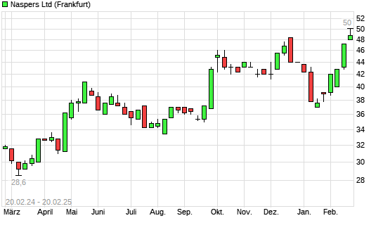 Mit dem Anstieg auf 250,00 EUR hat die Naspers-Aktie (ISIN ZAE000325783) am 19.02.2025 ein neues All-Time-High erreicht und damit den Kurs vom 18.02.2025 eingestellt.