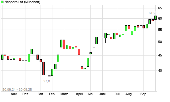 Mit dem Anstieg auf 304,00 EUR hat die Naspers-Aktie (ISIN ZAE000325783) am 29.09.2025 ein neues All-Time-High erreicht und damit den Kurs vom 18.09.2025 eingestellt.