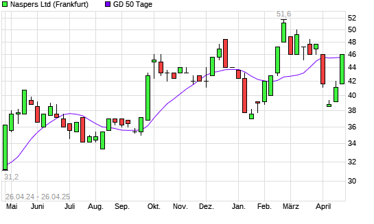Mit dem Anstieg auf 230,00 EUR hat die Naspers-Aktie am 25.04.2025 die 50-Tage-Linie nach oben gekreuzt.