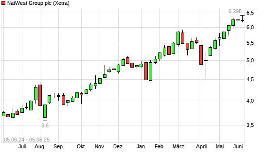 Mit dem Anstieg auf 6,34 EUR hat die NatWest Group-Aktie (ISIN GB00BM8PJY71) am 04.06.2025 ein neues 10-Jahres-Hoch erreicht und damit den Kurs vom 27.05.2025 eingestellt.