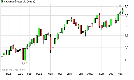 Mit dem Anstieg auf 6,85 EUR hat die NatWest Group-Aktie (ISIN GB00BM8PJY71) am 07.11.2025 ein neues 10-Jahres-Hoch erreicht und damit den Kurs vom 06.11.2025 eingestellt.