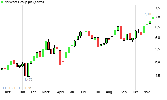 Mit dem Anstieg auf 6,97 EUR hat die NatWest Group-Aktie (ISIN GB00BM8PJY71) am 10.11.2025 ein neues 10-Jahres-Hoch erreicht und damit den Kurs vom 07.11.2025 eingestellt.