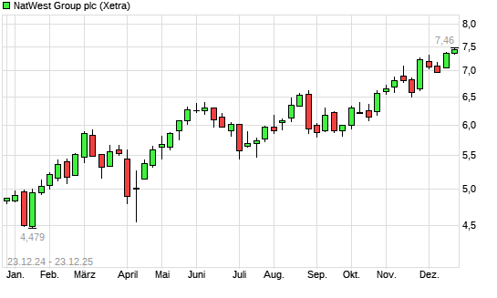 Mit dem Anstieg auf 7,35 EUR hat die NatWest Group-Aktie (ISIN GB00BM8PJY71) am 22.12.2025 ein neues 10-Jahres-Hoch erreicht und damit den Kurs vom 17.12.2025 eingestellt.