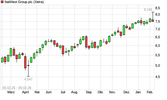 Mit dem Anstieg auf 8,15 EUR hat die NatWest Group-Aktie (ISIN GB00BM8PJY71) am 04.02.2026 ein neues 10-Jahres-Hoch erreicht und damit den Kurs vom 03.02.2026 eingestellt.