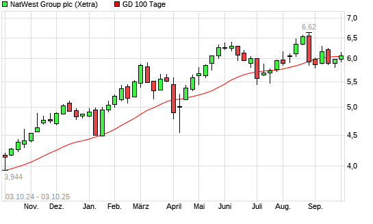 Mit dem Anstieg auf 6,09 EUR hat die NatWest Group-Aktie am 02.10.2025 die 100-Tage-Linie nach oben gekreuzt.