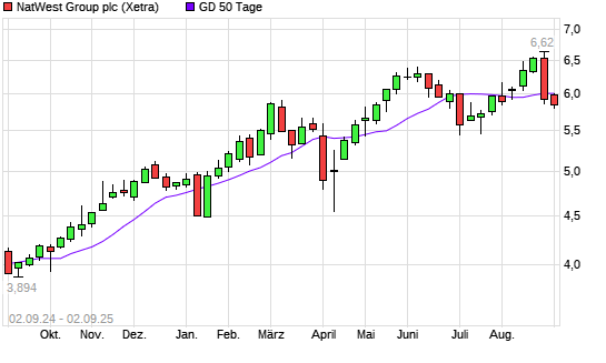 Mit dem Rücksetzer auf 6,00 EUR hat die NatWest Group-Aktie am 01.09.2025 die 50-Tage-Linie nach unten gekreuzt.
