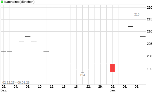 Mit dem Anstieg auf 216,00 EUR hat die Natera-Aktie (ISIN US6323071042) am 08.01.2026 ein neues All-Time-High erreicht und damit den Kurs vom 07.01.2026 eingestellt.