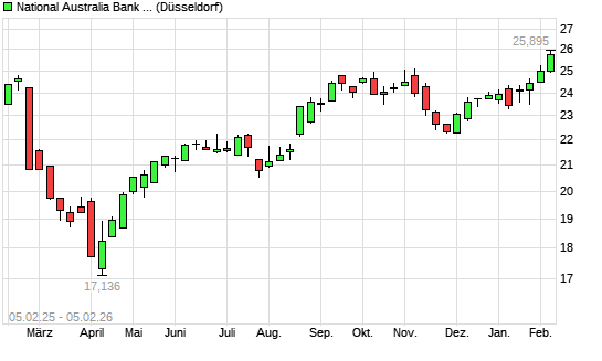 Mit dem Anstieg auf 25,62 EUR hat die National Australia Bank-Aktie (ISIN AU000000NAB4) am 04.02.2026 ein neues 10-Jahres-Hoch erreicht und damit den Kurs vom 03.02.2026 eingestellt.