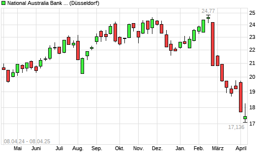Mit dem Rücksetzer auf 16,95 EUR hat die National Australia Bank-Aktie (ISIN AU000000NAB4) am 07.04.2025 ein neues 12-Monats-Tief erreicht und damit den Kurs vom 04.04.2025 eingestellt.
