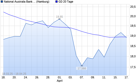 Mit dem Rücksetzer auf 18,59 EUR hat die National Australia Bank-Aktie am 17.04.2025 die 20-Tage-Linie nach unten gekreuzt.