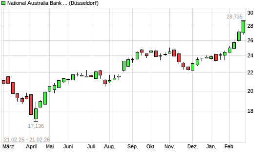 Mit dem Anstieg auf 28,46 EUR hat die National Australia Bank-Aktie (ISIN AU000000NAB4) am 20.02.2026 ein neues All-Time-High erreicht und damit den Kurs vom 19.02.2026 ...weiterlesen