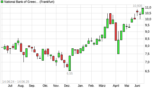 Mit dem Anstieg auf 10,94 EUR hat die National Bank Of Greece-Aktie (ISIN GRS003003035) am 13.06.2025 ein neues 5-Jahres-Hoch erreicht und damit den Kurs vom 28.05.2025 eingestellt.