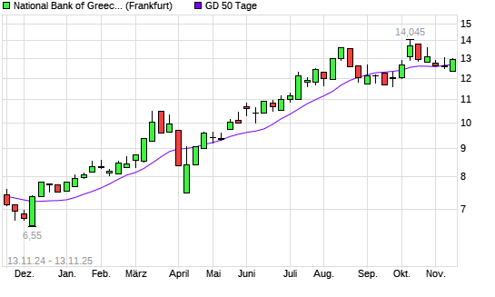 Mit dem Anstieg auf 13,00 EUR hat die National Bank Of Greece-Aktie am 12.11.2025 die 50-Tage-Linie nach oben gekreuzt.