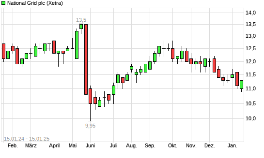 Mit dem Rücksetzer auf 10,90 EUR hat die National Grid-Aktie (ISIN GB00BDR05C01) am 14.01.2025 ein neues 6-Monats-Tief erreicht und damit den Kurs vom 13.01.2025 eingestellt.