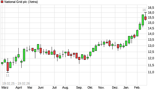 Mit dem Anstieg auf 16,00 EUR hat die National Grid-Aktie (ISIN GB00BDR05C01) am 18.02.2026 ein neues All-Time-High erreicht und damit den Kurs vom 13.02.2026 eingestellt.