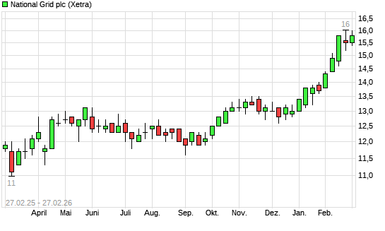 Mit dem Anstieg auf 16,40 EUR hat die National Grid-Aktie (ISIN GB00BDR05C01) am 26.02.2026 ein neues All-Time-High erreicht und damit den Kurs vom 18.02.2026 eingestellt.