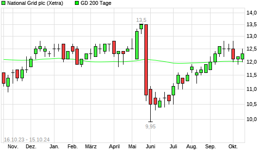 Mit dem Anstieg auf 12,00 EUR hat die National Grid-Aktie am 14.10.2024 die 200-Tage-Linie nach oben gekreuzt.