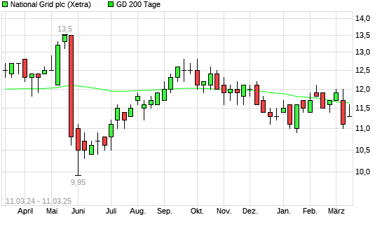 Mit dem Anstieg auf 11,70 EUR hat die National Grid-Aktie am 10.03.2025 die 200-Tage-Linie nach oben gekreuzt.