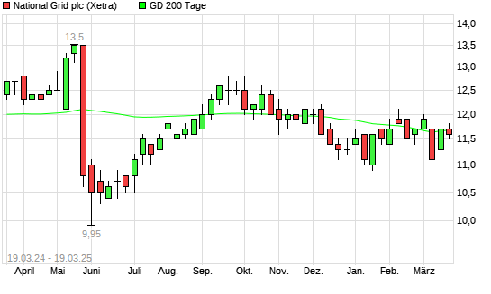 Mit dem Anstieg auf 11,70 EUR hat die National Grid-Aktie am 18.03.2025 die 200-Tage-Linie nach oben gekreuzt.